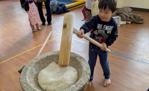 今日は稲刈りしたあとの藁をたたき、やわらかくしてしめ縄作りに挑戦!